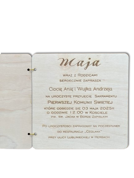 Pierwsza Komunia Święta to wyjątkowe wydarzenie w życiu dziecka i rodziny. Podkreśl jego doniosłość, zapewniając wytwarzanie w sposób! Otrzymaliśmy zaproszenie na Komunię wykonaną ze sklejki , która łączy elegancję z określonym stylem.